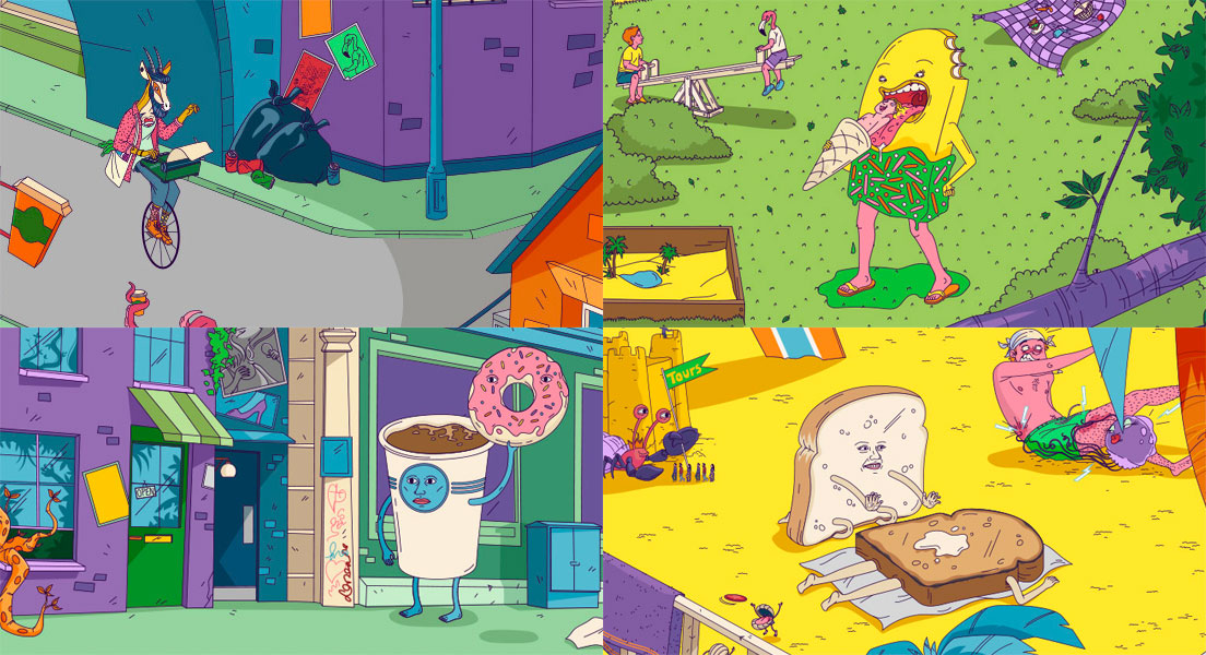 Our client’s creative team briefed us deliver their on-air summer idents for Europe, the Middle East and Africa. Weird World plays host to a strange and exotic environment populated by colourful and crazy characters including sunbathing toast, a man eating ice cream, an antelope riding a unicycle and a coffee cup eating a doughnut.