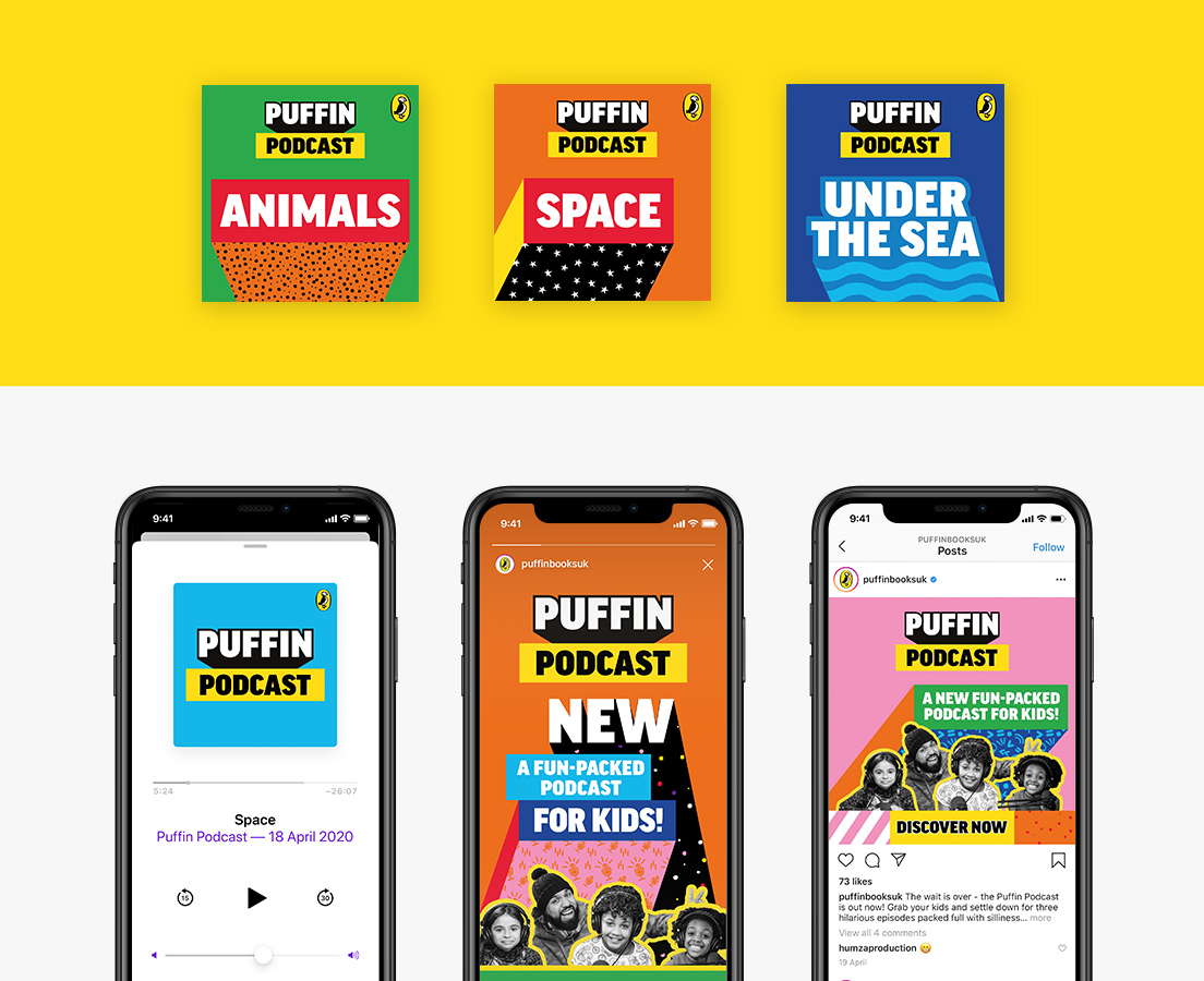 Our solution was to create a colourful abstract world for Puffin and all its characters to live in. We created a new Brand identity system including new fonts, colours and an extensive range of patterns. As well as the tools for their Dream Big, Read Puffin Campaign, with a logo, posters and POS. All characters and authors are now unified with a Puffin Yellow outline, and there is a system in place to house all information in a structured and eye-catching way.
